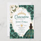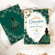 Emerald green, gold and white Quinceanera celebration invitation. Features brunette girl in ball gown dress, script font, gold butterflies, watercolor roses and tiara. Perfect for an elegant princess style glam celebration. Personalize with your own details. Printed Zazzle invitations or instant download digital printable template.