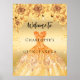 A welcome board for a Quinceañera, 15th birthday party. A faux gold background with faux gold glitter sparkles, a dress and roses, flowers. Personalize and add a name.