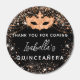 For an elegant Quinceañera, 15th birthday. A black background color. Decorated with faux gold glitter, sparkles and a golden masquerade mask. Personalize and add a name. With the text "thank you for coming"