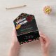 Impress your guests with this colorful Quinceañera invitation featuring vivid Mexican-themed floral decorations and golden confetti on the borders, decorated with a lovely red rose, a yellow sombrero, and a beautiful illustration of a red lowrider car on a black background. The lower part is customizable with your RSVP details.
