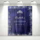 A tapestry for a girly and glamorous Quinceañera, 15th birthday party. A navy blue background, the blue color is uneven. Decorated with faux silver glitter dust. Personalize and add a name, age, date.