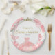 Unmask the enchanting allure of your quinceanera celebration with unique pink dress-themed paper plates. These bespoke paper plates, inspired by lush pink florals and whimsical butterflies, not only set the anticipation for the event but also hint at the stunning pink quinceanera dress reveal. They're completed with confetti details and a tiara accent, embodying the celebratory grandeur of the special day.