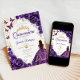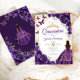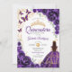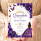Purple, gold and white Quinceanera celebration invitation. Features brunette girl in ball gown dress, script font, gold butterflies, watercolor roses and tiara. Perfect for an elegant princess style glam celebration. Personalize with your own details. Printed Zazzle invitations or instant download digital printable template.