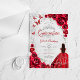 Red silver Quinceanera celebration invitation. Features brunette girl in ball gown dress, script font, silver butterflies, watercolor roses and tiara. Perfect for an elegant princess style glam celebration. Personalize with your own details. Stylish transparent or frosted acrylic invitations.