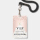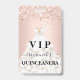 A modern, stylish and glamorous badge for a Quinceañera, 15th birthday party. A rose gold gradient background with rose gold faux glitter dust. With the text: VIP. Personalize and add name, age, address/date. The name is written with a modern hand lettered style script with swashes.