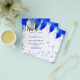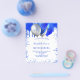 A white background. Decorated with royal blue faux glitter drips paint dripping look, sparkles. Royal blue and faux silver balloons. Personalize and add a name and party details. The name is written with a hand lettered style script.