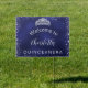 A welcome sign for a girly and glamorous Quinceañera, 15th birthday party. A navy blue background with elegant faux silver dust and a tiara, crown. The blue color is uneven. Personalize and add a name and age. White letters. The name is written with a modern hand lettered style script.