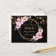 On front: Trendy tropical style. With a faux gold geometric frame decorated with pink hibiscus, flowers tropical florals with some greenery. A chic black background and golden stars. Templates for a name and date. Golden letters. The name and the text: Save the Date are written with a modern hand lettered style script.