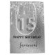 Elegant, classic, glamorous and girly for a Quinceañera, 15th birthday party. A faux silver metallic background. Decorated with faux glitter drips, paint dripping look. Personalize and add a name. With the text: Happy Birthday. The name is written with a modern hand lettered style script. Number 15 is written with a balloon style font.