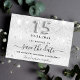 A trendy Save the Date for a Quinceañera, 15th birthday party. A faux silver looking background decorated with faux glitter, sparkles. Personalize and add a date and name/age. The text: Save the Date is written with a large trendy hand lettered style script. Number 15 with a balloon style font.
