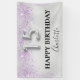 Elegant, classic, glamorous and girly for a Quinceañera, 15th birthday party. A faux silver looking background. Decorated with lavender colored faux sparkles.. Personalize and add a name. With the text: Happy Birthday. The name is written with a modern black colored hand lettered style script. Number 15 is written with a balloon style font.