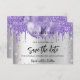 A faux silver looking background decorated with violet, lavender colored faux glitter and balloons. Personalize and add a date and name/age. The text: Save the Date is written with a large trendy hand lettered style script.
