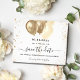 A chic white background decorated with faux gold glitter and balloons. Personalize and add a date and name/age. The text: Save the Date is written with a large trendy hand lettered style script.