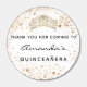 For an elegant Quinceañera, 15th birthday. A white background color, decorated with faux gold glitter dust and a tiara, crown. Personalize and add a name. With the text "thank you for coming to"