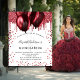For an elegant Quinceañera, 15th birthday. A stylish white background. Decorated with red faux glitter and balloons. Personalize and add a name, age and party details. The name is written with a hand lettered style script