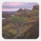 Square photo sticker with a tree in front of the mountains of the Quiraing landscape with pink colors in the sky at sunrise at Trotternish Ridge on the Isle of Skye in Scotland, UK.