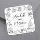 Personalized Hand-Drawn Quirky Wedding Stickers. These fun and playful square wedding stickers feature quirky doodle illustrations surrounding the design, including a champagne tower, wedding cake, disco ball, hearts, wedding bells, rings, cameras, and more. The bride and groom's names and wedding date are elegantly displayed beneath this whimsical artwork in a mix of handwritten script and simple fonts, offering a unique yet stylish look.