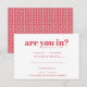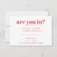 This adorably quirky wedding RSVP features a minimalist typography composition with sassy, modern wording. A perfect design for a couple who loves to show their humorous side! Add your custom wording to this design by using the "Edit this design template" boxes on the right hand side of the item, or click the blue "Customize it" button to arrange the text, change the fonts and colours and to also add additional information or images to this design. If you need any coordinating items, (thank you cards, etc.) please contact me for a custom order.