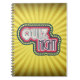 Quiz night trivia party spiral notebook. With big bold typography surrounded by dressing room lights. The background is a yellow sunburst pattern.