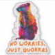 A quokka sticker typically features this small, adorable marsupial with a round face, short ears, and a friendly expression that seems to smile. Known for their docile and curious nature, quokkas are often depicted in a relaxed pose, either sitting or standing, with their big, bright eyes and bushy tail. The design may highlight the quokka's thick, brown fur and its charming, approachable demeanor. Whether realistic or stylized, the sticker captures the quokka’s endearing qualities, making it perfect for animal lovers, wildlife enthusiasts, or anyone who admires this cheerful and photogenic Australian native.