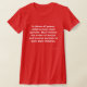 My overall review is that the T-shirt is nice, it fits true to size however the font is significantly smaller than advertised and you can't read it. The printing is unreadable and there is a strain to read it. It does not look like the advertised product. Maybe the shirt color is darker or a larger more visible font should have been used. Photos with and without flash and font is barely legible.
