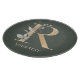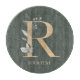 Letter R monogram floral. Letter R in golden brown texture accented with green watercolor compound leaves, flower blossoms and gold dust. Personalized with name in matching font.