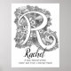 Pretty R monogram black ink drawing Zen style doodle. Art name and meaning inked doodle art poster is perfect for a girls bedroom. Personalize with your child's own name beginning with R, and name meaning for a truly personalized touch to your child's bedroom or nursery, this example is for the name Rachel A ewe. Strong willed, clever and kind, a loving friend. Choose the matt poster finish and you can color it in or gift it to a friend who loves coloring. © Unique R monogram drawing featuring items begining with R including, running rabbits, rainbows, roses, rockets, and raspberries. Description original ink drawing and design by Sarah Trett. www.sarahtrett.com for www.mylittleeden.com