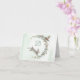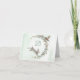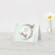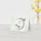 A pretty half wreath with a bird and jumping rabbit image is at the center of the front of this personalized note card. At the center of the wreath is your monogram. The image is placed on a subtle abstract gradient background.