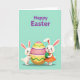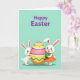 This design shows two white, human-like rabbits standing close together beside an oversized decorated egg 🐰. The rabbit on the left has rosy cheeks and leans its shoulder against the big egg, giving the scene a cozy, friendly closeness. The large egg is wrapped in pastel bands of sunny yellow and soft pink, with green chevron shapes and small yellow dots scattered across the stripes. On the right, the second rabbit wears a simple orange dress and holds a smaller deep green egg near its chest, as if offering it with a shy, affectionate grin 🐇. A calm aquamarine background keeps everything airy, while soft shading under their feet adds gentle depth. Across the top, a seasonal greeting is set in thick purple uppercase letters, centered above the characters. Both rabbits have wide eyes and small smiles, and the orange dress stands out against the cool blue backdrop and the pastel egg patterns. The smaller green egg has a smooth, glossy look, nestled against the rabbit’s orange dress.
