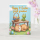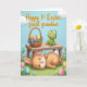 This card shows a sunny spring scene under an azure sky with puffy white clouds, where a lush green lawn is dotted with tiny blue and yellow flowers 🌷. In the grass, an upright-eared brown rabbit with wide eyes and pink inner ears lounges on its back, and the gentle tilt of its face gives it a sweet, friendly look 🐰. A rustic wooden table with visible grain sits nearby, and the rabbit’s small white tail peeks out just behind one leg of the table. On top of the table, a bright green frog with big eyes and a wide smile leans forward as if sharing a happy moment with the rabbit below. Next to the frog, a woven wicker basket tied with a blue bow is filled with pastel eggs in soft blues, pinks, yellows, and greens, each decorated with simple stripes, dots, or tiny shapes. More patterned eggs rest in the grass around the table, creating little pockets of color across the lawn. A flowing golden title is placed along the top edge against the sky, and the basket’s bow is a clear cerulean blue with two long ribbon tails draping over the wicker.