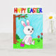 This design shows a white bunny sitting on rich green grass, with soft pink touches inside its ears, on its belly, and on its little paws 🐰. The bunny’s big eyes and tiny red nose give it a gentle, friendly look, and it hugs a bright magenta basket close like a small gift meant for someone special. Behind it, a light blue sky is brushed in loose strokes that suggest a calm spring day, setting a relaxed scene for friendship or a sweet romance. On the left side, a brown tree with a textured trunk and fresh green leaves leans into the picture, adding a cozy, outdoorsy backdrop. Across the top edge, the words “HAPPY EASTER” sit along the upper margin, with each letter in a different color such as red, yellow, orange, green, and blue. On the right side, two simple red flowers with sunny yellow centers stand out against the grass 🌷. Dark outlines define the bunny, the basket, the tree, and the flowers, and the sky stays a pale blue behind them.