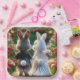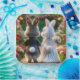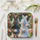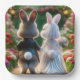 Two cute rabbits dressed as a bride and groom stand hand in hand on a garden path surrounded by vibrant flowers