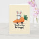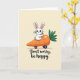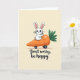 This design shows a small fluffy white rabbit with wide round eyes and pink-lined ears riding atop an oversized orange carrot, giving the scene a friendly, flirty little adventure 🐰. The carrot is drawn like a tiny vehicle with small dark wheels underneath, as if it’s ready to roll across the page. The rabbit’s front paws sit forward like it’s holding reins, and its upright posture suggests eager confidence, like it’s showing off for a companion nearby 🐇. A tuft of leafy green tops the carrot at the back, adding a fresh garden touch that frames the rider. Everything sits on a smooth warm beige background that keeps the focus on the pair and their cozy, upbeat connection. Near the lower area of the card, a short phrase appears in flowing cursive-style lettering, set in a dark tone that stands out clearly against the light background. The letters are centered beneath the carrot rider, leaving generous open space around them for an airy look. The carrot’s orange body is outlined with darker lines, and the green leaves fan outward in simple rounded shapes.