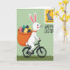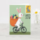 This card shows a cheerful white rabbit pedaling a simple black bicycle, its pink inner ears and rosy cheeks turned in profile as if hurrying to meet a friend 🐇. An orange shoulder bag bounces at its side, stuffed with decorated egg shapes in pink, teal, sunny yellow, and deep navy, mixing dots and stripes like little gifts for someone special 🌷. The background is a soft green field that fades into a darker, textured foreground suggesting spring leaves along the path. Gentle daylight and a fine grainy texture give the scene a printed, cozy look, like a note meant to be carried close. In the upper right, a stamp-like frame with a serrated edge holds a smaller gray rabbit, gazing outward as if waiting for the delivery. Tiny numbers and short mail-style wording sit inside that stamp area, reinforcing the idea of a letter on the move. Nearby, the main greeting text appears in large, hand-drawn letters, placed to the right side and set in a dark ink color for easy reading. The eggs peek out of the orange bag in a layered stack, with one navy-striped egg sitting near the top.