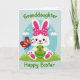 This greeting card features a pixel-style spring scene with a sweet white rabbit at the center, its big eyes and rosy cheeks giving it a tender, friendly look 🐰. A pink bow rests near its ears, and the ear interiors are a deep pink-purple, adding a soft touch of romance to the character’s expression. The rabbit sits low in bright green grass, holding a green egg close as if it’s a small gift meant for someone special. Behind it, a light blue circular sky is dotted with small white clouds, keeping the setting airy and calm. Near the rabbit’s face, a butterfly hovers in red, yellow, and deep purple, as though leaning in for a gentle hello 🌷. The word “Granddaughter” appears centered along the top in a dark, easy-to-read color, while “Happy Easter” is centered along the bottom in matching lettering. The egg shows pink and green decorative patterns, and the clouds sit scattered inside the blue circle above the grass.
