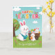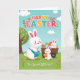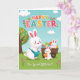 This card shows a spring scene with three stylized white rabbits gathered together, with the tallest rabbit on the left wearing teal overalls and leaning slightly toward the others in a protective, friendly way 🐰. To the right, one smaller rabbit holds an orange egg covered in tiny patterns, looking up as if sharing a secret with its companion. Another little rabbit peeks out from a rustic wooden cart, its ears tilted forward as though eager to join in 🐇. Behind them, a bright blue sky with a few soft clouds sits above a wide stretch of green grass dotted with pink tulips 🌷. A flowering tree stands to the left, adding pale blossoms that frame the group like a gentle backdrop for their closeness. Across the top, a celebratory phrase appears in rounded, multi-colored letters, centered and easy to spot. Near the bottom, a smaller line of message text sits beneath the illustration in a flowing, dark-colored style. The cart is piled high with decorated eggs in green, blue, pink, and yellow, each with stripes, dots, and little shapes.