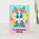 Designed with a sweet, stylized rabbit at the center, this card features a teal body with a white blaze on the face and a white belly, giving it a gentle, friendly look 🐰. The rabbit’s big eyes, tiny heart-shaped nose, and rosy cheeks suggest a tender, affectionate mood, as if it’s shyly offering a gift to someone special. Long ears with pink inner details stand upright, adding to the attentive pose. In its paws, it holds a small basket with purple-and-white stripes, filled with smooth orange egg shapes that feel like a shared springtime find 🐇. A ring of flowers frames the character, mixing pastel pink, sunny yellow, and soft white petals with orange centers, threaded with light green leaves. Behind everything, the background fades in a vertical gradient from aqua at the top to blush pink near the bottom, keeping the scene airy and soft. Near the lower portion, friendly purple text is placed prominently, standing out clearly against the lighter backdrop. The floral wreath circles the rabbit evenly, with blossoms and leaves spaced all around like a gentle halo.
