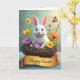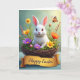 This card features a fluffy white rabbit nestled in a rustic twig basket, its bright eyes and small pink nose giving it a sweet, friendly look 🐰. Around the basket, spring flowers in deep purple, sunny yellow, and warm orange crowd in close, like they’re leaning toward the bunny in a gentle cuddle. Green leaves and tiny buds fill the gaps, adding soft layers that make the scene feel cozy and a little romantic in its tenderness. In the upper right, an orange-and-black butterfly hovers mid-flutter, bringing a light, lively touch 🐇. The background fades into a mint-green blur, like fresh outdoor air on an early spring morning. Along the bottom, the scene sits on a lightly textured pale blue wooden surface, giving it a calm, homey setting. A golden banner stretches across the lower area with a celebratory message printed in a flowing, cursive-style font in a darker contrasting color. The banner curves gently over the blue wood, with the basket and flowers rising just above it.