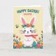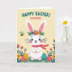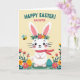 This design shows a stylized rabbit with tall ears lined in soft pink, framing a gentle face that seems to gaze forward with a tender, friendly calm 🐰. A small crown of pink and orange blossoms sits among leafy green sprigs on its head, and a red scarf drapes loosely at the neck like a cozy hug. The background is a warm, glowing yellow that reads like early spring sunlight, setting a light, affectionate tone for the scene. Along the bottom, layered flowers in red, orange, and purple mix with green stems, creating a garden bed that feels like it’s been arranged for someone special 🌷. Tucked into the plants are two decorated egg shapes—one with golden stripes and another in speckled blue—nestled side by side like a quiet pair. Off to the left, a tiny yellow-and-black winged insect with pale blue wings hovers near the rabbit, adding a lively little companion to the moment. Near the top, rounded lettering in teal with pink accents arcs across the scene, centered above the rabbit’s ears. The teal-and-pink text sits against the yellow sky while the striped gold egg and the speckled blue egg rest among the flowers below.