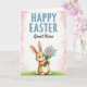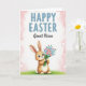This card features a light brown, human-like bunny standing on a green patch of grass, holding a full bouquet close as if it’s a gift for someone special 🐰. Its rosy cheeks, wide shining eyes, and small smile suggest a sweet, friendly affection, like it’s greeting a loved one face to face. The bouquet mixes soft pink and gentle sky-blue flowers, with petals layered to look light and fresh for spring 🌷. Across the upper area, the words “HAPPY EASTER” sit in rounded blue letters that feel cheerful without being loud. Just beneath that, “Great Niece” appears in black, written in a flowing, cursive style that adds a more tender note. The background is a pale pink wash with soft white highlights, giving the scene a calm, airy setting. Small white dots are scattered throughout the pink backdrop, like floating pollen or tiny sparkles in the air.