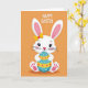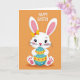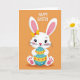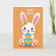 This greeting card features a white cartoon rabbit sitting in the center against a warm orange background, with big shiny eyes, soft lashes, and rosy cheeks that give it a sweet, friendly look 🐰. One ear has a small yellow bow, and the pink inner ears stand out gently against the white fur. The rabbit’s paws cradle an oversized decorated egg, held close like a thoughtful gift shared between close friends. Across the top, a seasonal greeting appears in large white letters, spaced clearly above the character. The egg is wrapped in wide turquoise bands with yellow stripes, and bright red stars repeat across the design like little sparks of celebration 🌷. Tiny dotted accents add extra texture to the patterns, making the egg look carefully adorned. Flat, bright lighting keeps the shapes crisp and easy to see, with the orange backdrop staying smooth and solid behind the rabbit and its colorful egg. The turquoise stripes shimmer with dotted highlights, and the red stars pop sharply along the egg’s curved surface.