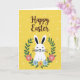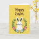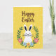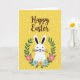 This greeting card features a stylized white rabbit with closed, contented eyes, a small curved smile, and fine black whiskers, giving it a tender, friendly look 🐰. The rabbit sits in the lower half of the design, nestled inside a half-circle wreath of deep green leaves that feels like a gentle embrace. Tucked into the foliage are soft blossoms in blush pink, light blue, and warm yellow-orange, like a shared spring bouquet between close friends 🌷. The background is a bright yellow field that adds warmth, sprinkled with small white dots that float like airy confetti. Near the top, the words “Happy Easter” appear in dark brown lettering, centered above the wreath for an easy-to-read greeting. The contrast between the dark text and sunny backdrop keeps the message clear without crowding the illustration. The wreath curves upward around the rabbit, with pastel flowers spaced between leaf clusters along the arc.