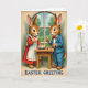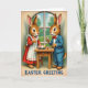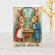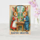 Designed with two rabbit-like characters facing each other across a small wooden table, the scene suggests a sweet connection in the way they lean in and hold each other’s gaze 🐰. On the left, the rabbit wears a red dress with a white apron, standing with a welcoming posture as if hosting a cozy spring meal. On the right, the companion is dressed in a sky-blue suit with a red bow tie, holding a small glass of red drink and a fork, paused mid-bite as though savoring the moment together 🐇. Behind them, an arched window frames a leafy green view in soft daylight, giving the room a gentle, storybook feel. Centered on the tabletop sits a plate filled with pastel-colored eggs, adding a seasonal touch without overpowering the scene. Fine details show in the brown fur texture, the apron’s ruffled edges, and the neat creases of the suit, all set against slightly faded borders that resemble an older printed card. There is no wording on the front, leaving the artwork to speak for itself, with the arched window’s pale trim curving above the pair in the background.