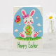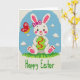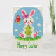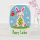 This card shows a stitched-look illustration of a sweet white bunny sitting front and center on bright green grass, with pink inner ears, rosy cheeks, and tiny pink paw pads 🐰. A rich fuchsia bow rests near one ear, and the bunny’s gentle, slightly shy expression feels like it’s meant for a close friend. Its front paws cradle a large green egg, held close like a small gift, decorated with curling red swirls that add a festive touch. Behind the bunny, a rounded band of sky in clear blue frames the scene, with a few soft, cloud-like shapes floating high above. A small red winged insect with tiny white accents hovers near the bunny’s head, as if leaning in for a quiet hello 🌷. Along the bottom edge, a short Easter greeting appears in green lettering, centered and easy to spot against the grassy base. The whole image is built from tiny stitch-like squares, from the bunny’s outline to the red swirls on the egg and the little insect’s wings.