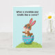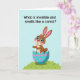 This greeting card shows a cute, human-like bunny with warm brown fur, pink inner ears, and big blue eyes that seem to glance up with a friendly, inviting look 🐰. A soft pink blush sits on its cheeks, and a few darker brown spots add detail across its body as it peeks out from a cracked egg. The egg shell is turquoise with wavy pink bands and scattered pink dots, giving it a festive, sweet look that feels like it’s meant to be shared between close friends. The bunny rests on a gently rolling green hill with a few simple grass strokes, set against a wide sky-blue background that keeps the scene airy and calm 🌷. Near the top, a line of black sans-serif text asks, “What is invisible and smells like a carrot?” centered and easy to read. The bunny’s upright posture and slightly tilted head add a tender, curious energy, like it’s waiting for someone special to answer back. The cracked shell pieces angle outward around the bunny, with jagged edges and bright turquoise fragments framing its little paws.