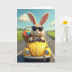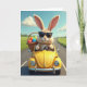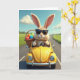 This card features a soft, plush-like rabbit with tall upright ears and a small pink nose, wearing dark sunglasses as it drives a sunny yellow open-top car down a country road 🐰. The rabbit’s paws wrap the steering wheel with an easy confidence, and the scene feels like a friendly adventure meant for two. A woven basket sits in the back seat, packed with smooth, brightly colored egg-shaped treats that suggest a spring celebration 🌷. Green fields stretch out on both sides, and the road narrows into the distance beneath a wide blue sky dotted with small white clouds. Any greeting text sits near the top in a light pastel tone, with a shorter line placed near the bottom in a deeper shade for contrast. Sunlight creates gentle shadows across the rabbit’s fuzzy texture and along the rounded curves of the car, with small metallic highlights on the bumper. The yellow car has rounded contours and a shiny chrome front, and the basket’s braided pattern is clearly visible behind the driver.