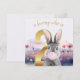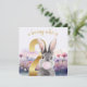 Gray rabbit blowing a pink bubble gum in a field of wildflowers