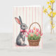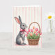 Perfect for sharing a sweet spring moment, this card features a gentle grey bunny standing upright beside a woven basket of flowers 🐰. The bunny has a white belly, a fluffy tail, and long ears with soft pink inner fur, and a bright pink ribbon tied at its neck adds a tender, gift-like touch. Its reddish-brown eyes tilt toward the overflowing basket as if admiring it the way a close friend watches you arrange something special. The basket is warm brown and tightly woven, brimming with tulips in coral pink and soft apricot, tucked among leafy green stems 🌷. Behind them, the background is filled with softly painted vertical stripes in white and blush pink, giving the scene a light, airy setting. A short Easter greeting sits near the top in pink lettering, balanced so it doesn’t crowd the illustration. Gentle lighting brings out the bunny’s fur texture, the basket’s weave, and the smooth tulip petals as they lean slightly to the right. Share your Easter sentiments with someone you care about.