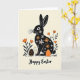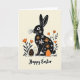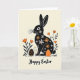 This card features a stylized rabbit in a deep, dark silhouette, facing left with upright ears and a calm, attentive stance 🐇. Its body is filled with small floral motifs in soft white and warm orange-yellow, like a gentle pattern you might share with someone close. Around the rabbit, thin stems rise into simple blossoms in the same orange-yellow, leaning toward it as if in a quiet, friendly conversation 🌷. Near the bottom, several egg-shaped forms sit together, each decorated with dots and small pattern marks in black, white, and orange-yellow. The background is a creamy, light tone that keeps the scene airy and gives the shapes plenty of breathing room. A few short dashed lines run near the base to anchor the artwork without adding clutter. Beneath the illustration, a flowing seasonal greeting appears centered in a dark ink color. The rabbit’s patterned body, the clustered dotted eggs, and the orange-yellow flowers stand out crisply against the pale backdrop.