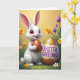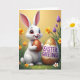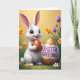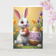 This design shows a white, rabbit-like character 🐰 with fluffy fur and large red-orange eyes, smiling wide with two front teeth and a gentle, friendly look. It sits low in a thick patch of emerald grass where yellow daffodils, purple tulips, and small white blossoms cluster close, as if the flowers are leaning in like close companions. The rabbit’s paws cradle a smooth brown egg-shaped object, held carefully as though it’s being saved for someone special. Nearby, a larger cream-and-gold egg-shaped decoration rests in the grass, catching warm light from the golden-yellow background. Curving golden-brown flourishes wrap around the big egg, creating a frame that feels like a soft embrace. Centered on that egg, the words “EASTER GREETINGS” appear in bold lavender letters, standing out clearly against the pale surface 🌷. The background fades from deeper gold to lighter yellow, and the tulips show a mix of tight buds and open blooms around the rabbit’s feet.